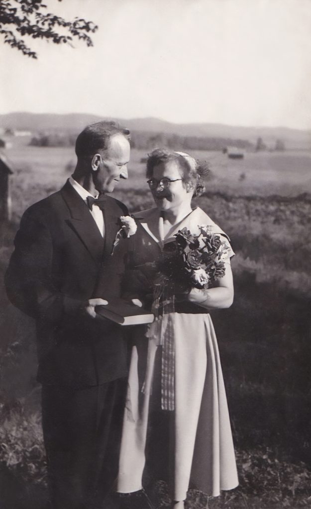 Salli ja Aleksi Raivion pihassa kuvattuna hääpäivänään.
