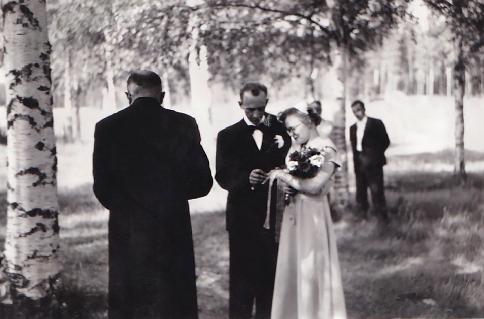Sallin kotitalon pihalla Sotkamossa kuvattu vihkitilaisuus heinäkuussa 1955. Tilaisuuden valokuvaaja ei ole tiedossa.