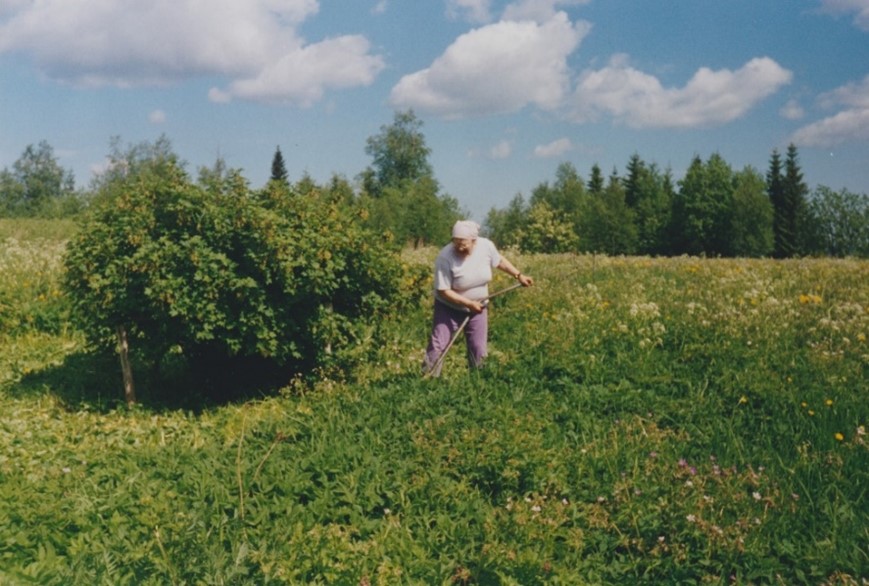 Aleksi heinänteossa ja Salli pihan kasvillisuutta niittämässä